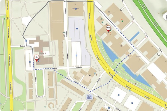 Vraťte se na světelnou křižovatku, přejděte ji po levé straně k budově parkoviště, pokračujte rovně k budově Generali a casina, za ní zahněte vlevo.